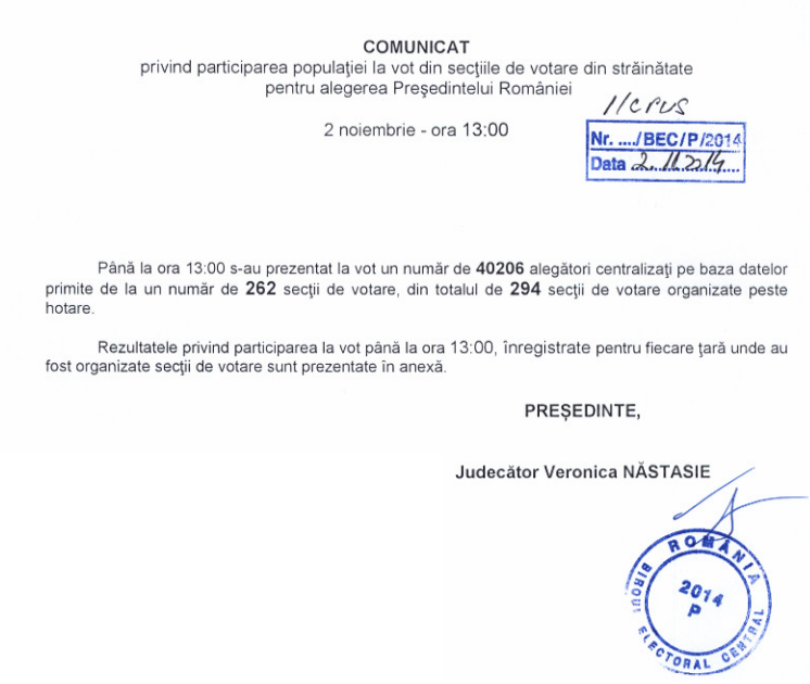 ORA 13:00 Au ieșit la vot 40.206 de alegători. Aceștia au fost centralizați pe baza datelor primite de la cele 262 secții de votare, din totalul de 294 secții de votare din străinătate.