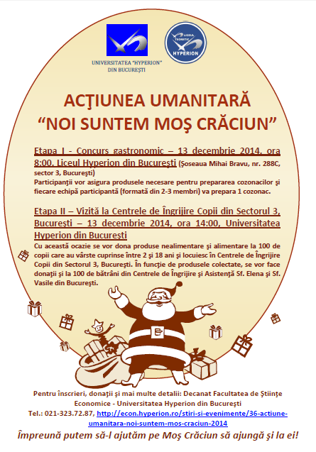 Facultatea de Știinte Economice din cadrul Universității Hyperion și Liceul Hyperion din București organizează acțiunea umanitară „Noi suntem Moș Crăciun” la centrele de îngrijire din Sectorul 3, București.