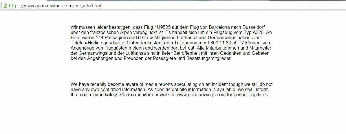 După prăbuşirea avionului, site-ul Germanwings a fost blocat. Aşa arată acum site-ul: