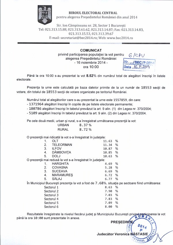 Ora 10:00: Potrivit primelor estimări, prezența la vot la nivel național a fost de 8,52%, informează Biroul Electoral Central.