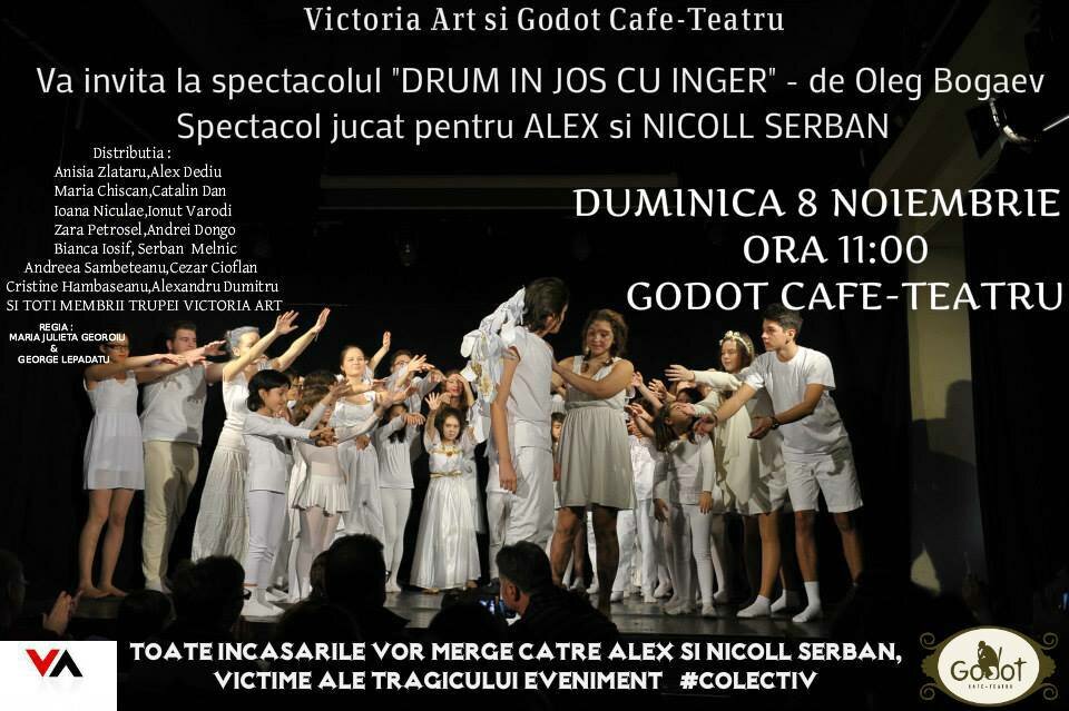 Godot Cafe-Teatru a susținut duminică 8 noiembrie, la ora 11:00, spectacolul caritabil intitulat “Drum în jos cu înger” după Oleg Bogaev. Biletul de intrare a costat 20 de lei iar întreaga sumă va fi donată pentru Nicoll și Alex Șerban, frații aflați în spital în urma tragediei din clubul Colectiv. Impresionant de mare a fost numărul persoanelor dornice să participe la evenimentul caritabil, de peste 100 de persoane. Cu toate că sala a avut capacitatea depașită, oamenii au continuat să vină chiar și cu condiția de a nu găsi un loc liber. Oamenii au stat în picioare, lângă bar, în ușă sau pe treptele scărilor.