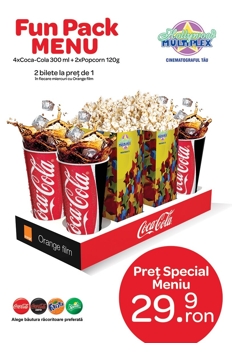 Meniul Fun Pack a fost creat de Hollywood Multiplex în parteneriat cu Coca-Cola și Orange, în exclusivitate pentru clienții Hollywood Multiplex București Mall.