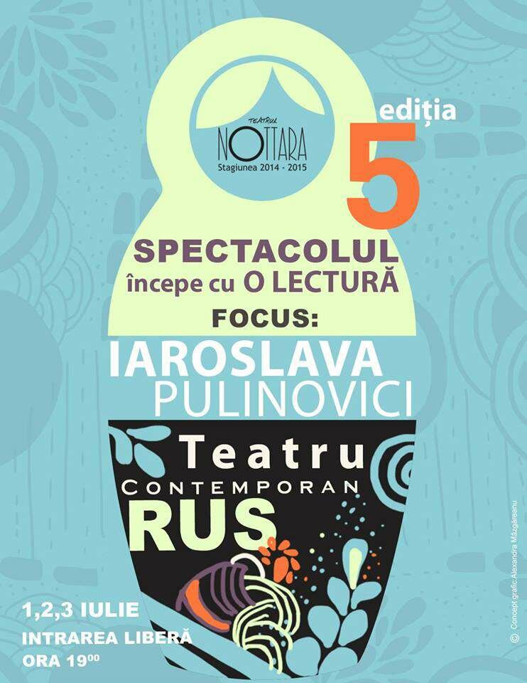 A 5-a ediţie a proiectului „Spectacolul începe cu o lectură”, organizat de Teatrul Nottara, aduce pe scena sălii George Constantin trei piese ale autoarei Iaroslava Pulinovici, o cunoscută scriitoare contemporană din Rusia.