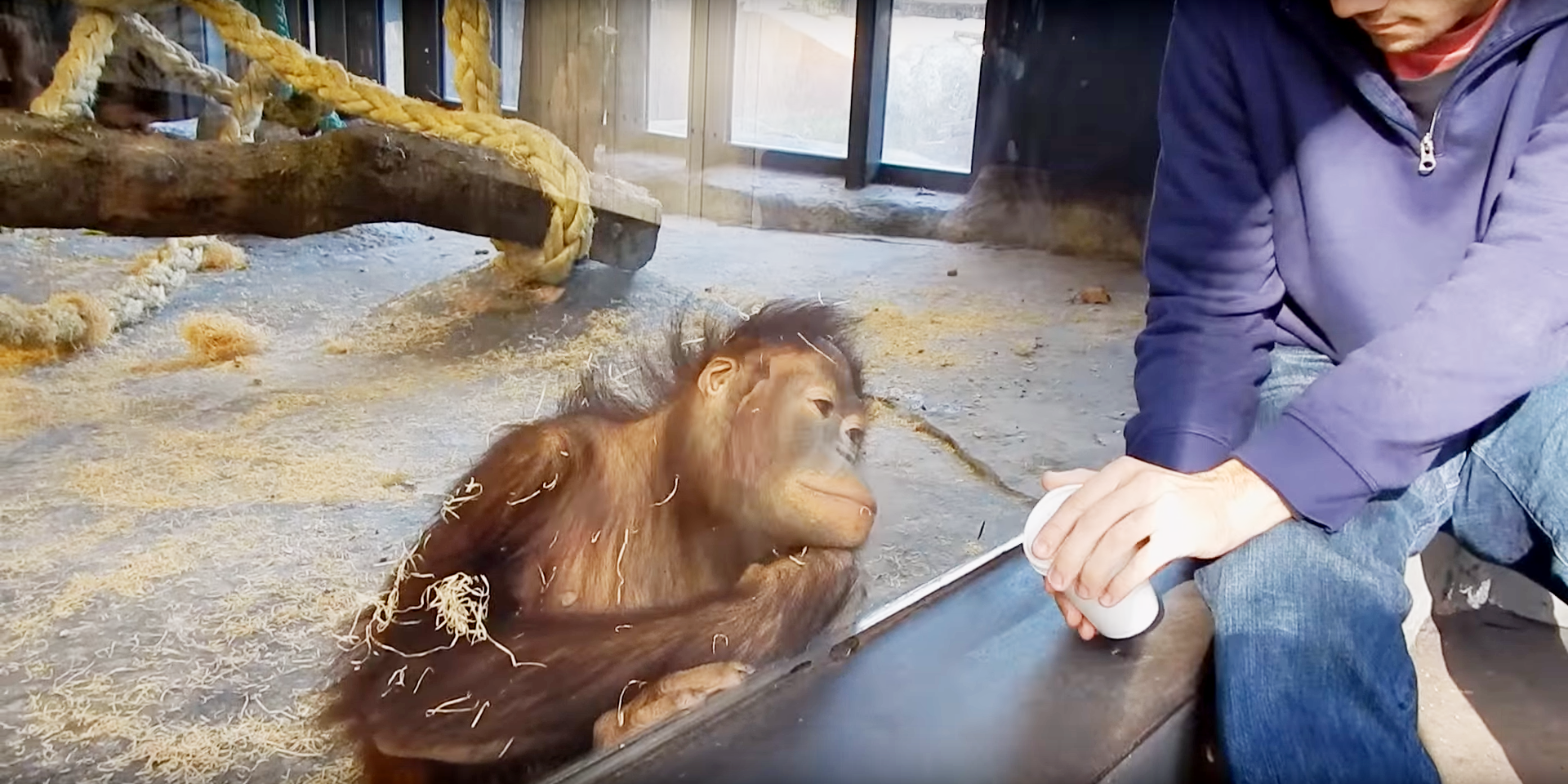 Vizitatorul pune într-un pahar o castană, o arată animalului, zgâlțâie puțin recipientul și castana dispare. Când urangutanul observă că aceasta a dispărut, se lasă pe spate râzând cu gura până la urechi.